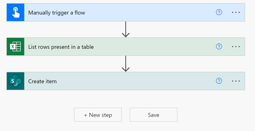 In order to complete the flow, you’ll need to add a few additional steps to it. These are shown in the image below and include manually triggering the flow, listing the rows present in a table, and creating an item in the SharePoint list. You’ll use connectors to set up these steps and line up where the data goes in the flow.