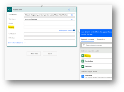 Simply match the Column in Excel to the Field in SharePoint. You may need to use the search bar, or scroll down in the Dynamic Content to find what you are looking for.