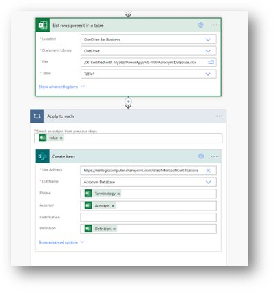 The next step is to find the file in the location you stored it, such as OneDrive, and find the table in the Excel file. Note that you must put the data into a table for this step to work. This step lists the rows present in the table.